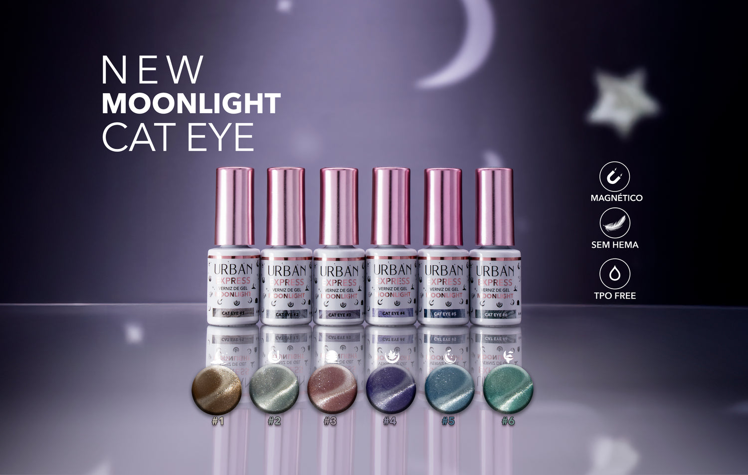Descubra a coleção de Verniz Gel magnético Express Moonlight Cat Eye, a coleção de cores de verniz gel magnético com uma elevada concentração de partículas que proporciona um efeito de profundidade e um brilho intenso que se adapta à luz e ao movimento.