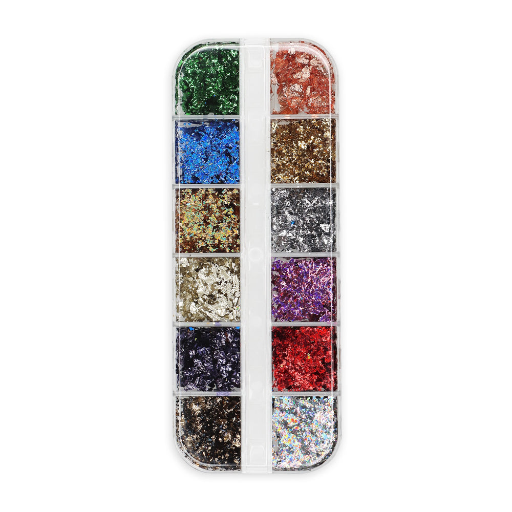Estojo com 12 cores de soft foil - micro folha. Poderá aplicar encapsulado no gel ou acrílico. Poderá também usar apenas como decoração, nesse caso aplique com uma camada de Gemty Gel.