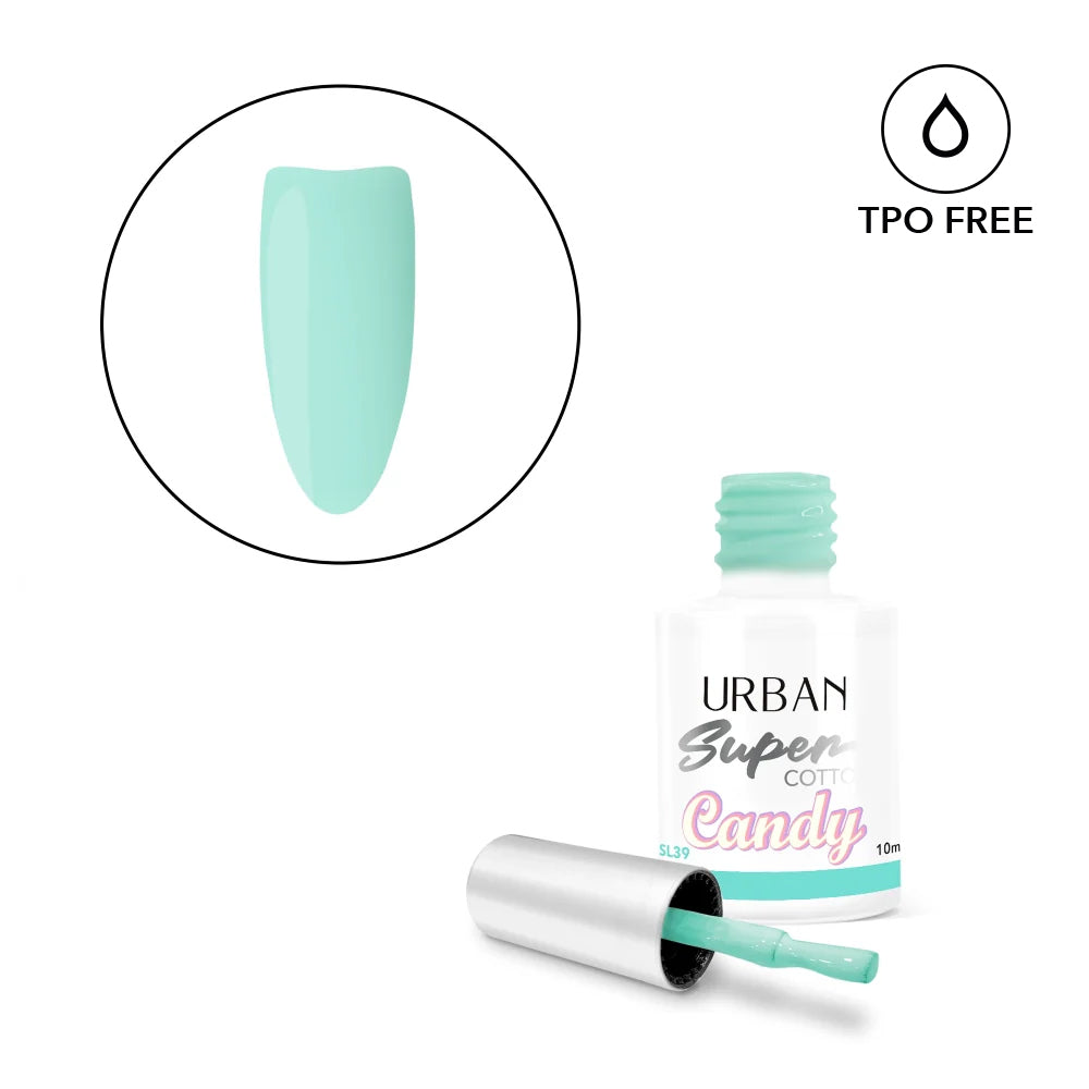 Descobre a cor de verniz gel Super Lac Cotton Candy #SL39 de tom verde-água pastel, ideal para manicures impactantes e sofisticadas.