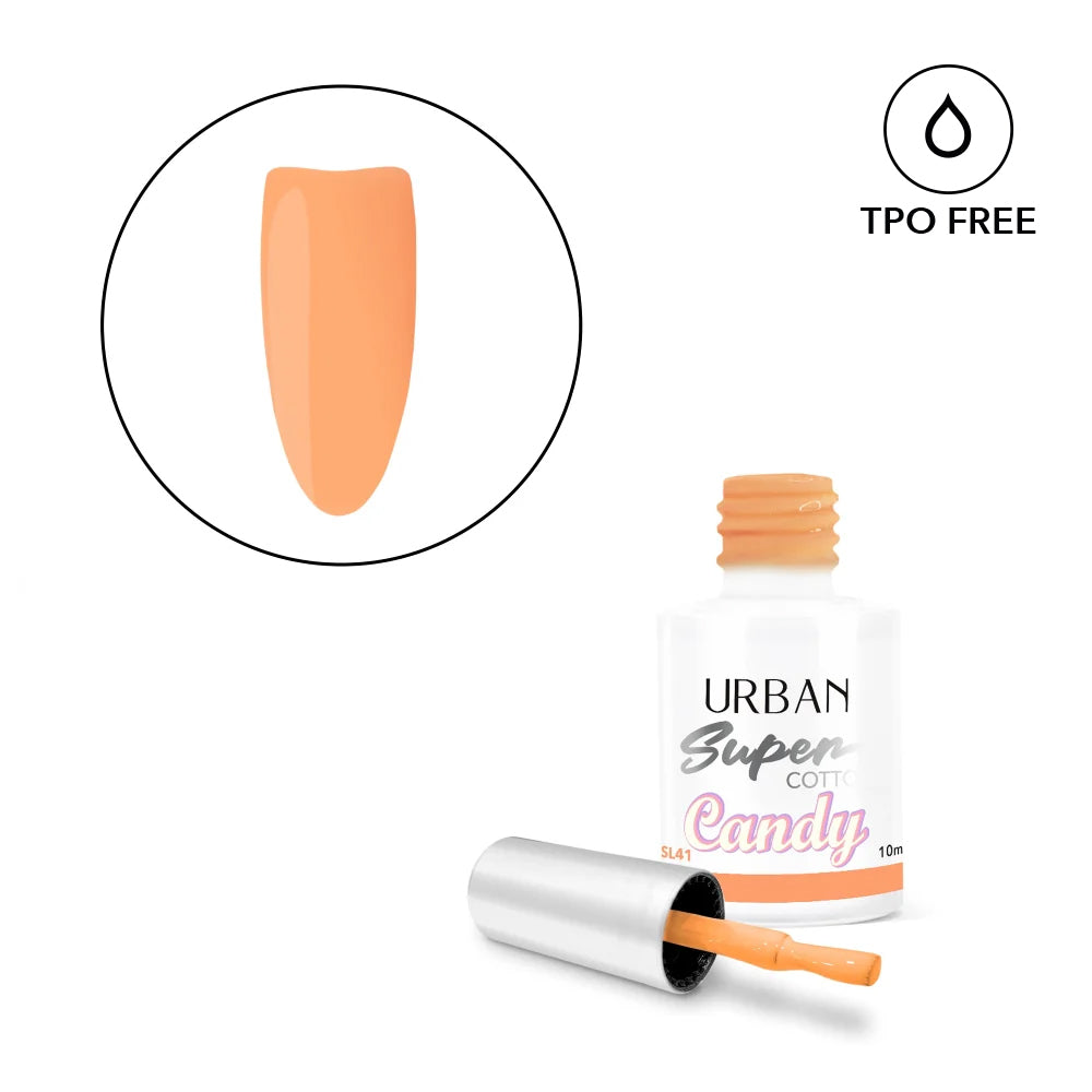 Descobre a cor de verniz gel Super Lac Cotton Candy #SL41 de tom laranja pastel, ideal para manicures impactantes e sofisticadas.