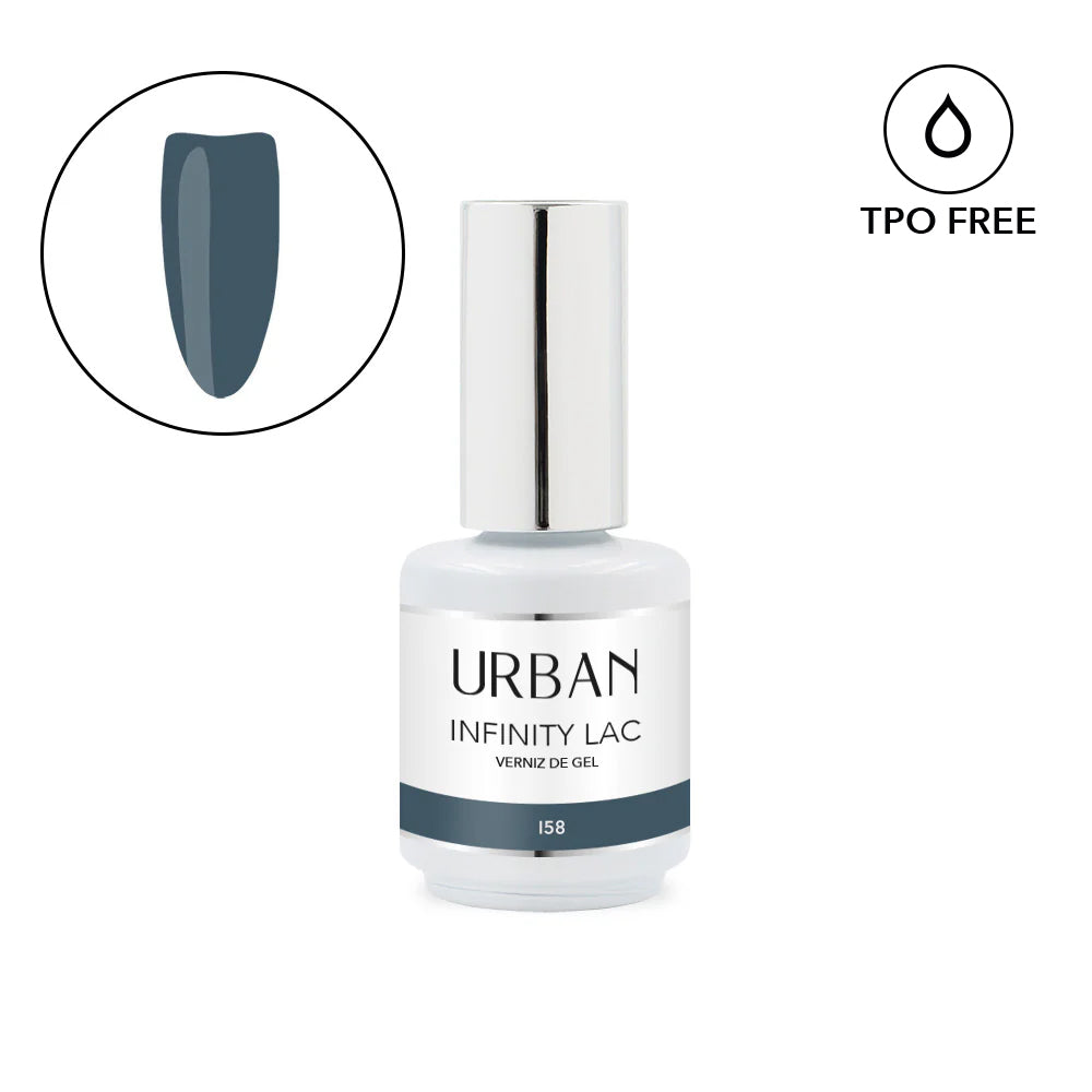 Descubra a cor de verniz gel Infinity Lac I58, com tom azul acinzentado que combina a elegância natural com a durabilidade e o brilho incomparáveis do verniz gel.