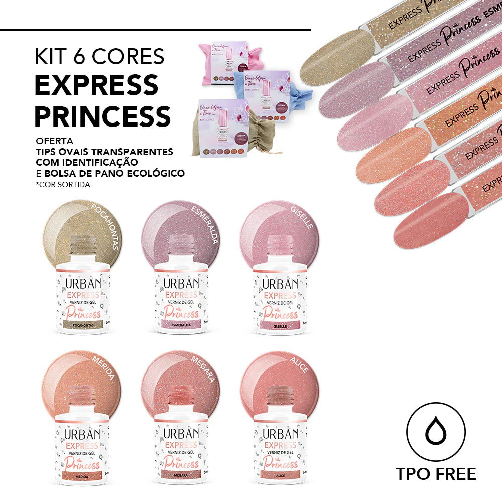 Este kit contém 6 cores de verniz de gel da coleção Princess - 2ª Edição. Na compra do kit recebe de oferta uma bolsa de pano ecológico e 6 tips transparentes ovais com etiqueta a identificar a cor.